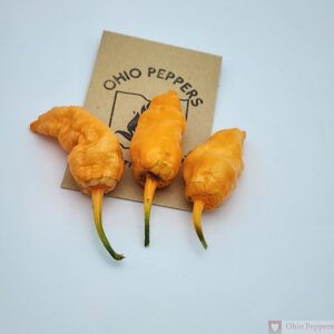 Four generations in to a highly stable fruit! Highly productive, very hot. Coloration is very similar to Jay’s Peach Ghost Scorpion, Peach X, or WHP 054 – but with that cool bleeding calyx.