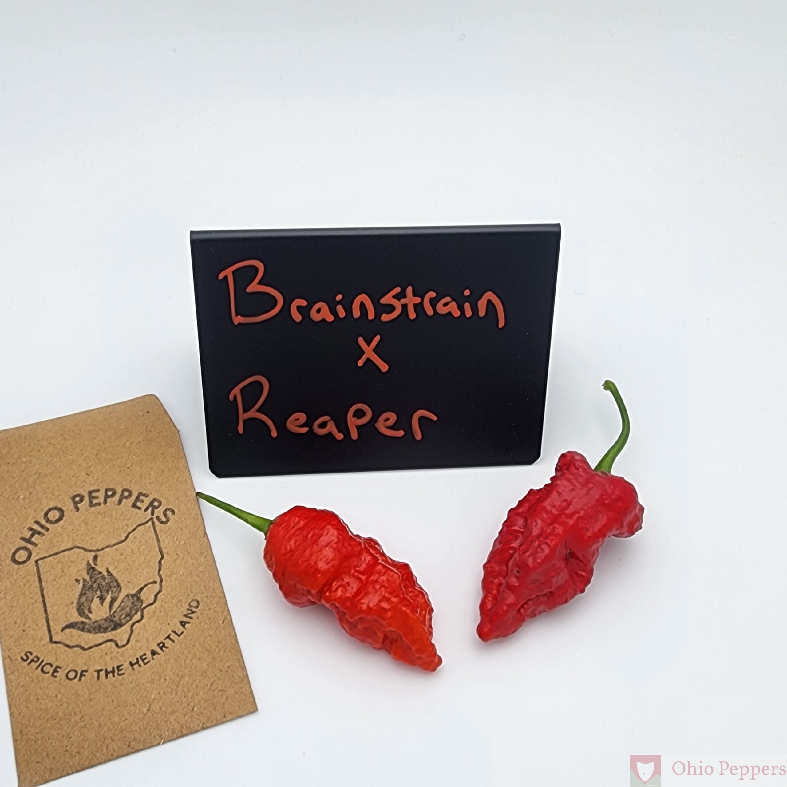 Thin walled superhot, this pepper is a big grower – which will provide a large (but late) Ohio harvest. Produces well into October if covered during frost. Flavor is a major selling point for the Brainstrain x Reaper.