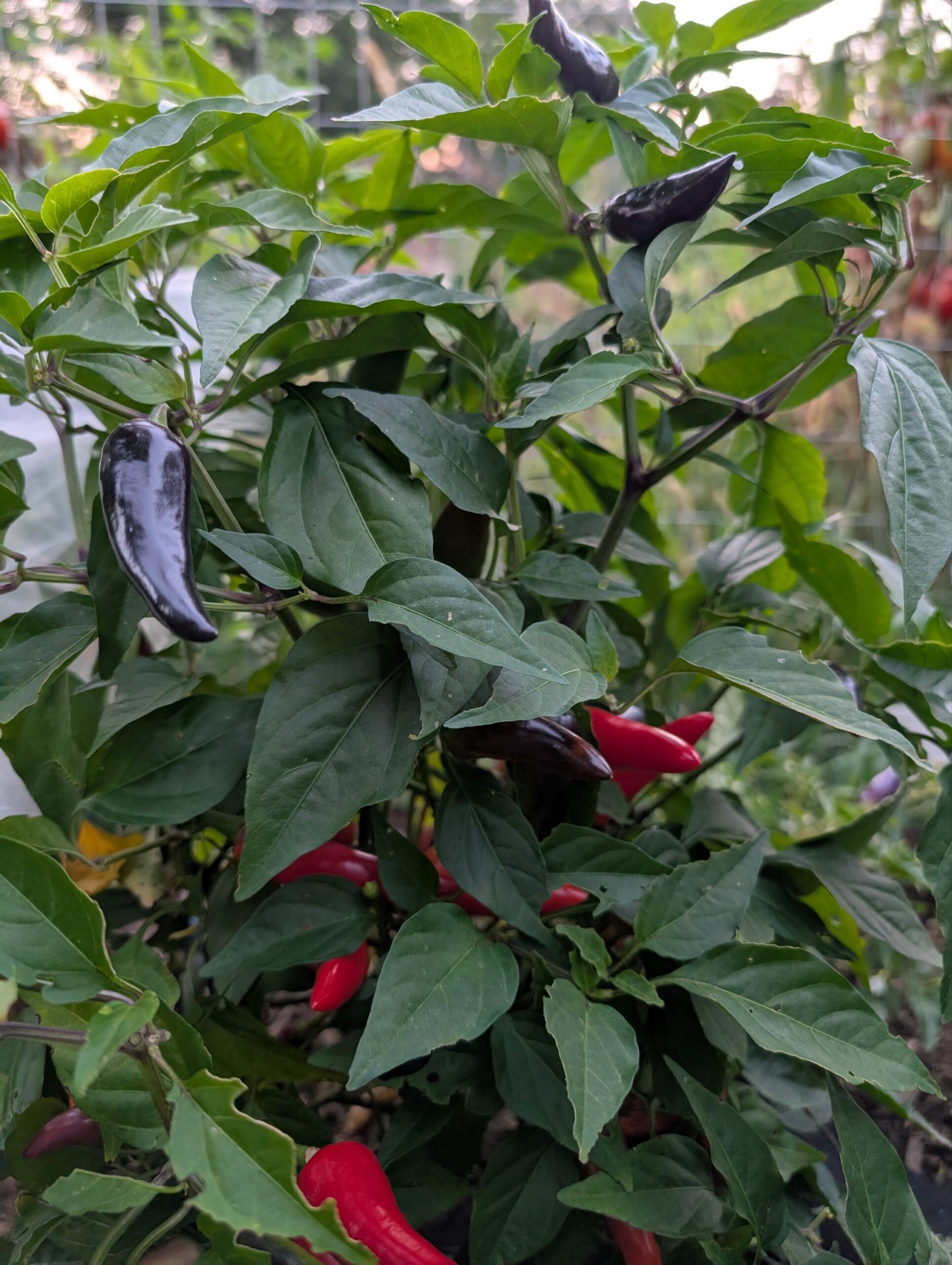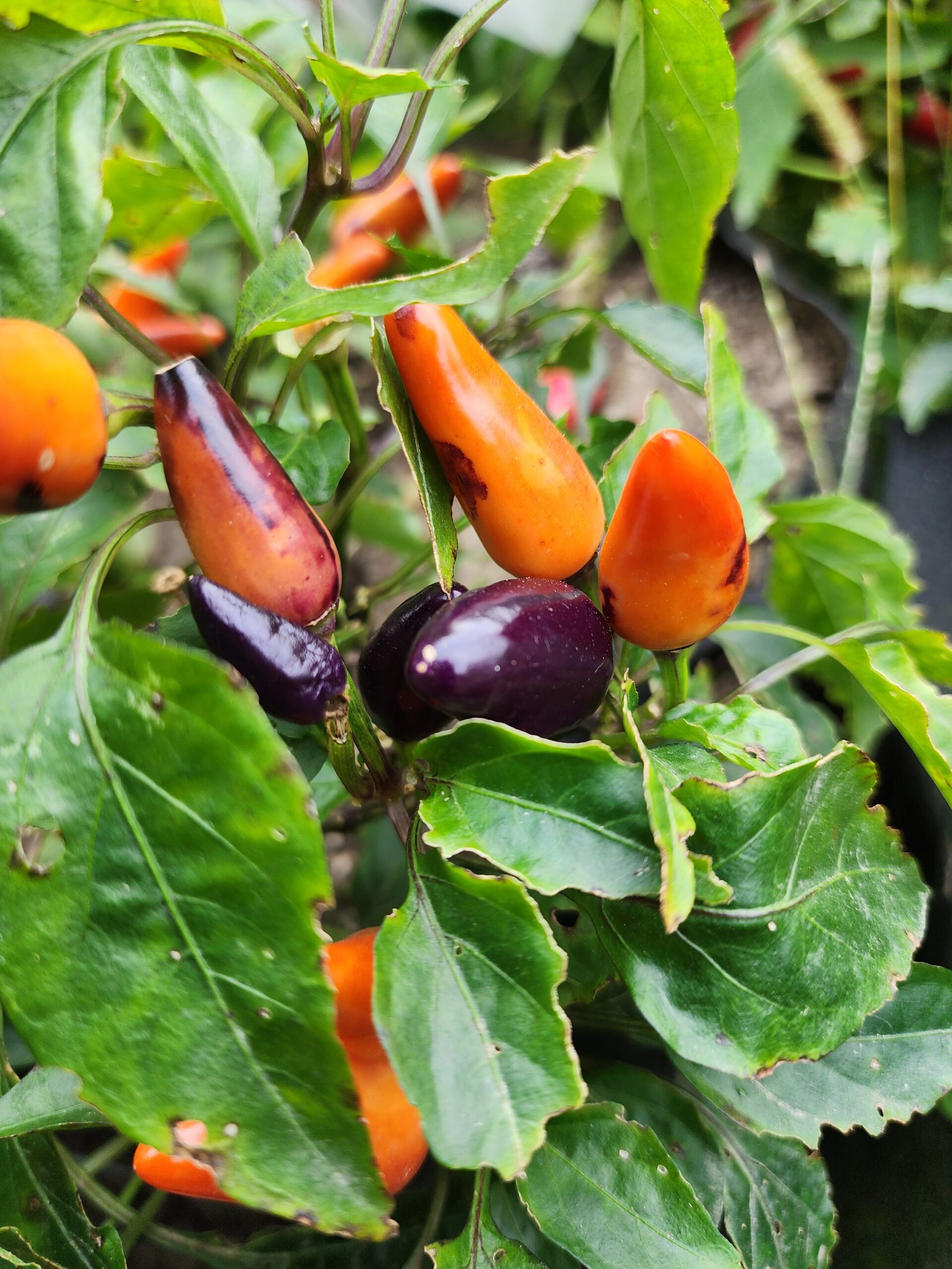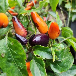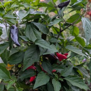 The Cabai Burung Ungu, meaning “Purple Bird Pepper,” is a Malaysian heirloom chili (Capsicum frutescens). I like it for its ornamental beauty and culinary uses. The attractive produces an abundance of small, elongated peppers that transition from deep purple to cream and finally to bright red upon full maturity. This is the only rainbow shifting frutescens I’m familiar with. These peppers offer a spicy, flavorful profile, making them suitable for many uses – though one of the more appealing uses is to put fresh pods in stews and soup type dishes for a more complex flavor profile.