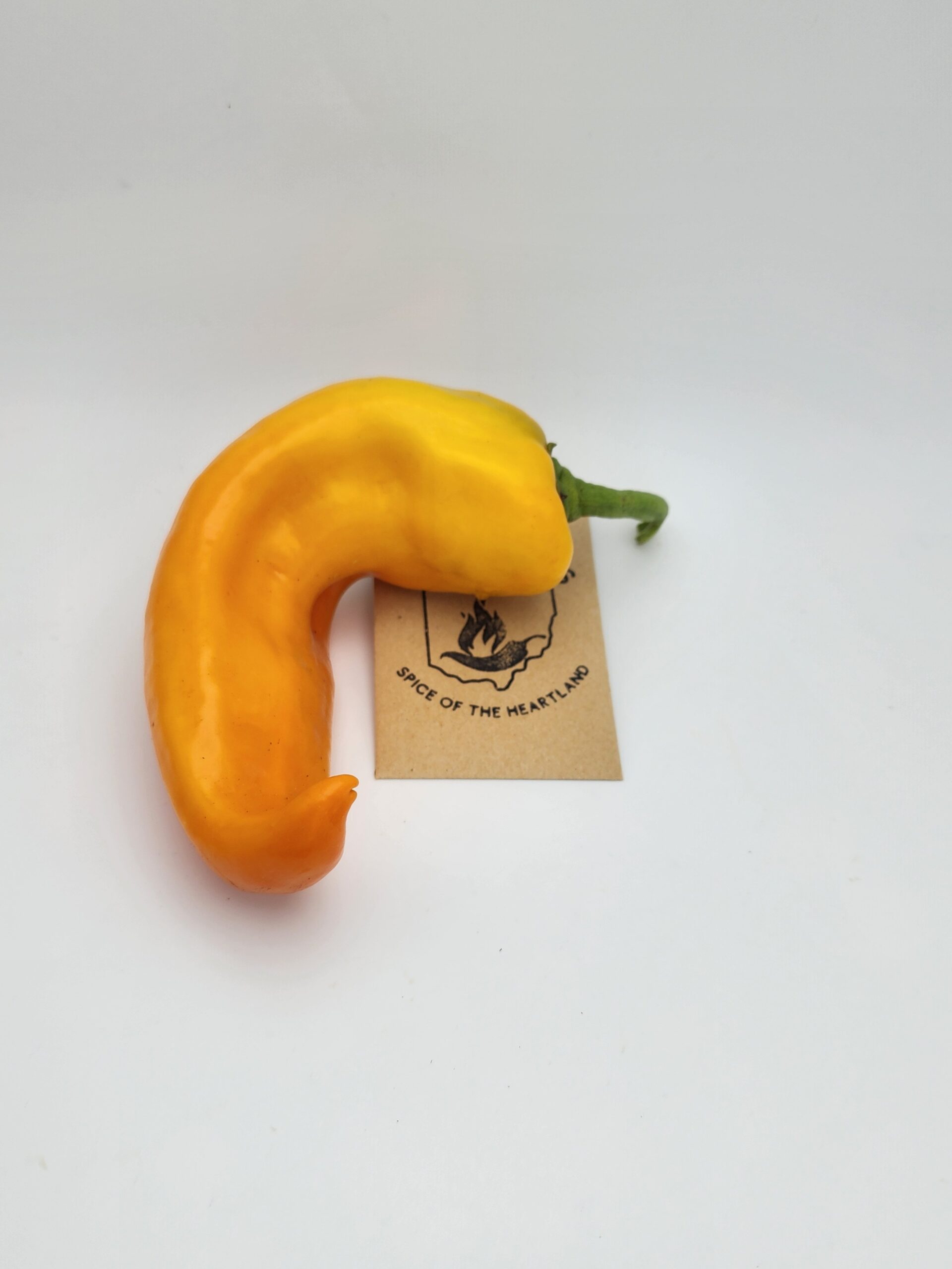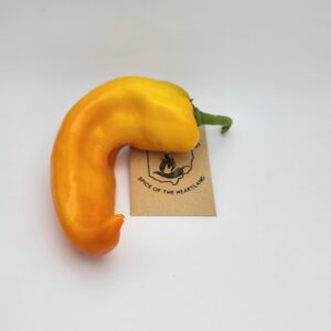 Corno di Toro Giallo is a yellow version of a traditional Italian sweet pepper. A Capsicum annuum, the fruit have a long, tapered, horn-shape. Heat is essentially nonexistent. The fruits have thick, crisp walls and a mild, slightly sweet flavor. This variety is commonly used for frying, roasting, or grilling, where the flesh softens without losing structure. Plants are productive and well-suited to warm summer growing conditions.