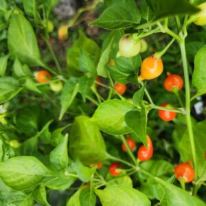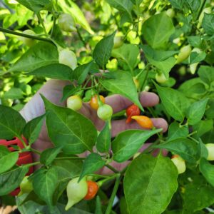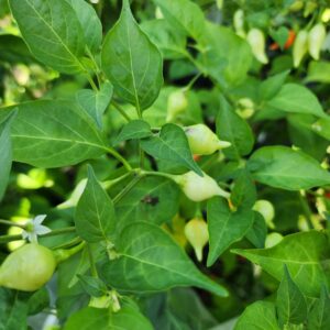 The small, teardrop-shaped pods are crisp and lightly sweet with just a little heat, around 5,000 SHU. It’s a solid all-around utility pepper and crazy productive. It’s easy to chop fresh into dishes, blend into hot sauce, or dry for a mild pepper flake.