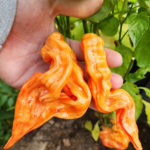 If you’re looking for a pepper that’s more on the sweet side but still packs a punch of flavor – and don’t want to violate any trademarks or plant patents – look no further than the “South African C. baccatum similar to the Goldew pepper”. This is the golden version of the low-heat round, thick fleshed C. baccatum, highly prized when pickled in a sweet brine and well as consumed fresh.? See the peach (Peachadew) and traditional red (malawi piquante) versions for more information.