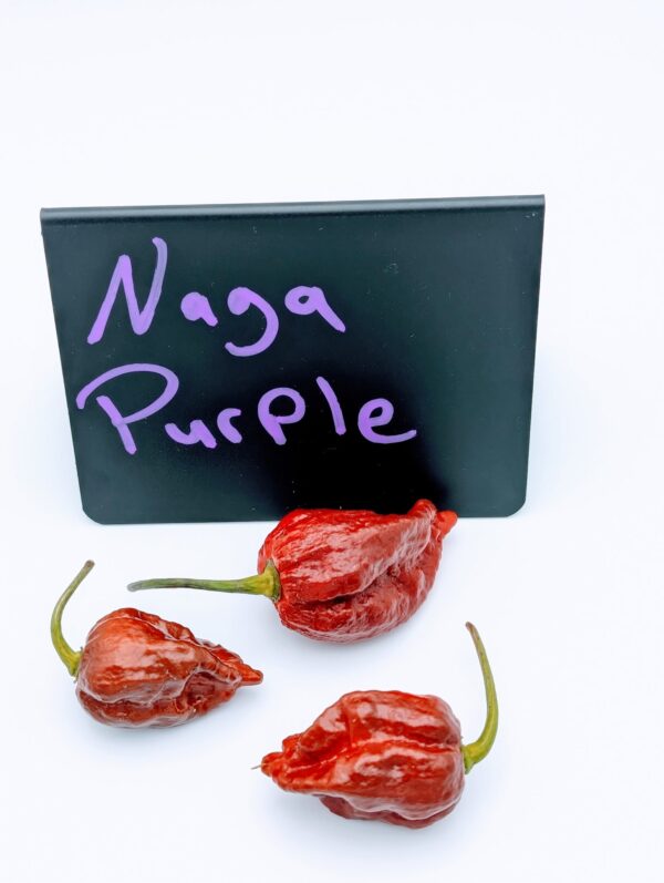 Naga Purple – a darker super hot related to the Naga morich. Young developing fruit transition from a dark green/purple to ripen a highly unique hot cocoa color.