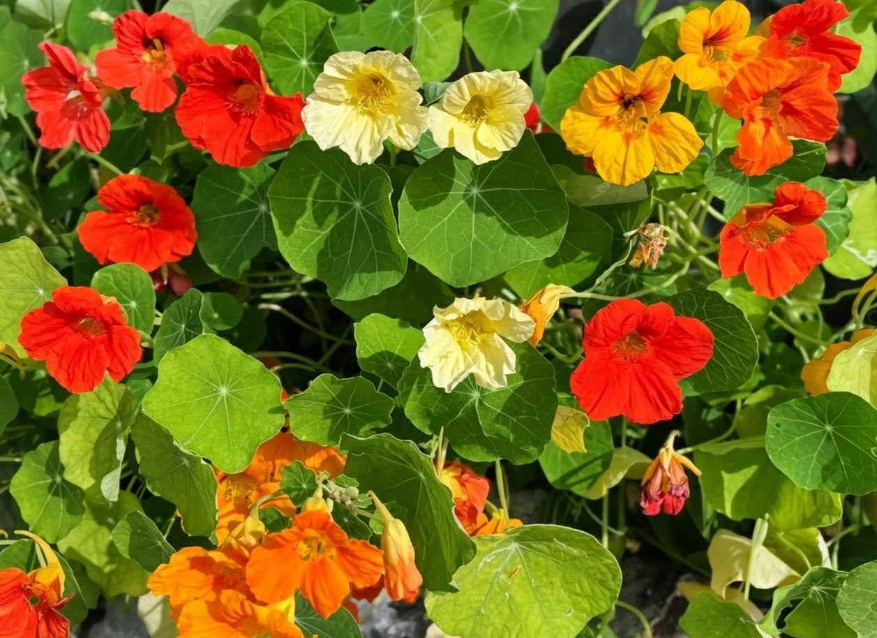 Bright, trailing nasturtiums with round leaves and bold flowers. Colors for these particular ones run orange, yellow, and red. Plants spread easily and work well along edges, beds, and containers. They grow fast and don’t need much fuss.
