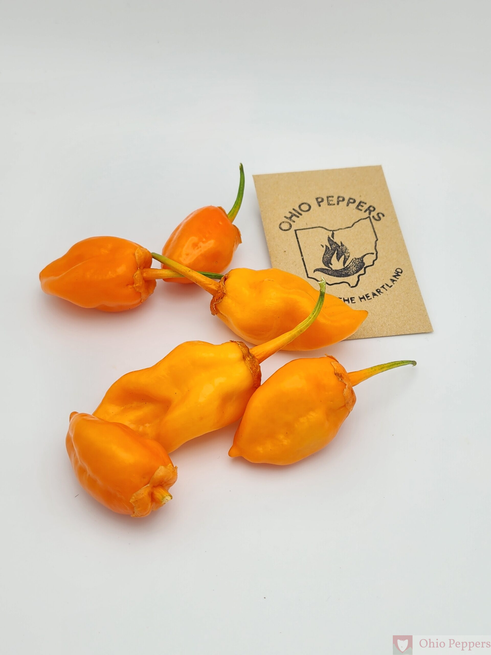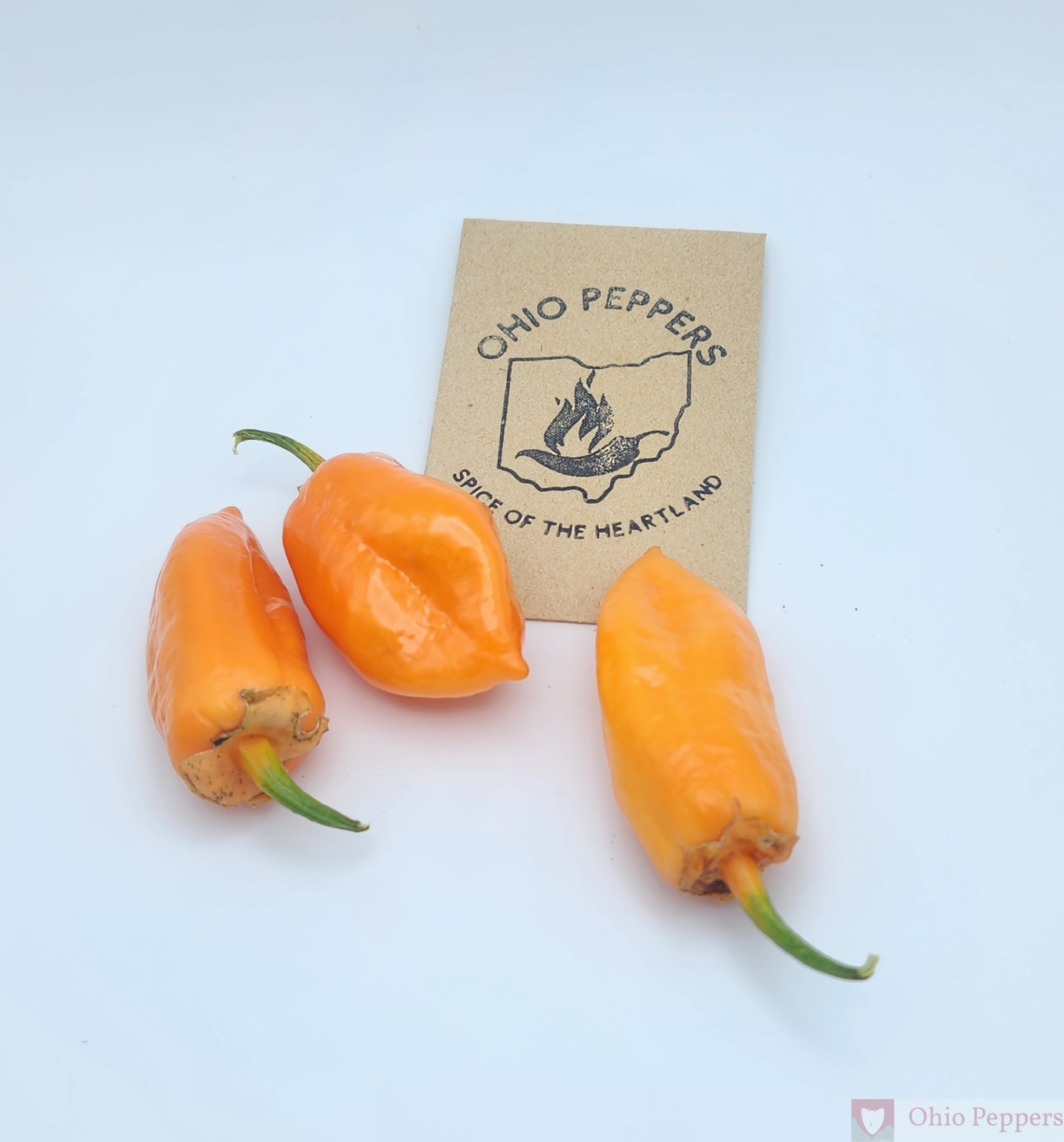 The Point Pleasant Gum, orange, is a new pepper and is quite the stunning pepper. The lineage starts off with the Purplegum – a dark foliaged smoother pheno habanero/BBG7, with orange fruit. A customer brought me some of his fruit that grew off phenotype. A great “spill” eliminated our Purplegum seeds. Lesson learned: Don’t leave pepper seeds on the dinning table when kids are around. Once spilled, all seeds are disposed of. Can’t risk mixing up any seeds! All we had left: The off-phenotype fruit, given too us to evaluate. Easy solution!