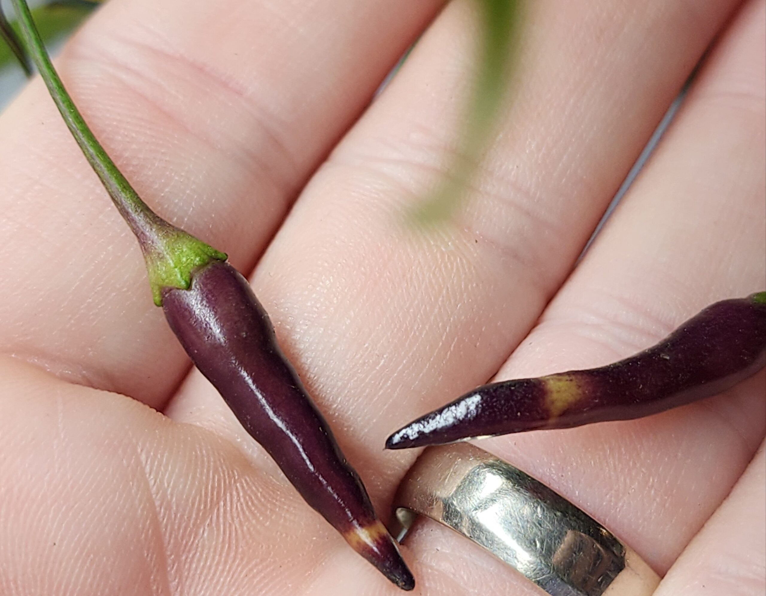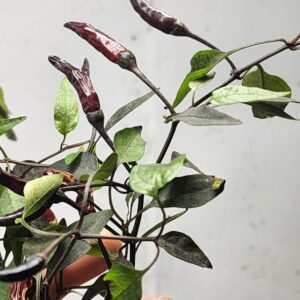 This is a striking variety of Thai pepper, notable for its unique color transformation. The peppers start off as a beautiful lavender shade and then mature into a rich purplish-red. With a heat level typical of Thai chilies, they pack a punch in the 50-75K Scoville Heat Unit range, offering a blend of spiciness and flavor that’s characteristic of Thai cuisine. The plant itself is a standout with its dark foliage and an abundant mix of purple and red fruits, making it not only a culinary delight but also a top-tier ornamental choice. Among the taller pepper plants, Thai Kali Mirch has the added advantage of bearing thin, light fruits, which helps prevent the plant from bending under the weight, a common issue in taller varieties. This combination of aesthetic appeal and robust flavor makes Thai Kali Mirch a unique and desirable addition to any garden.