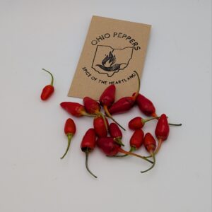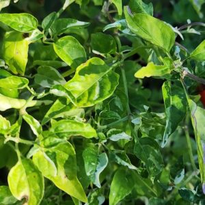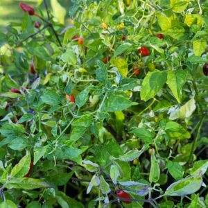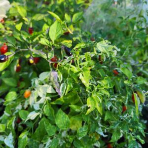 Variegated Pequin is a pequin-type annuum with strong leaf variegation and small upright fruit. Fruit turn from a dark purple, almost black, to a deep red when ripe. Heat is high, usually in the 30,000 to 60,000 SHU range, consistent with standard pequins.