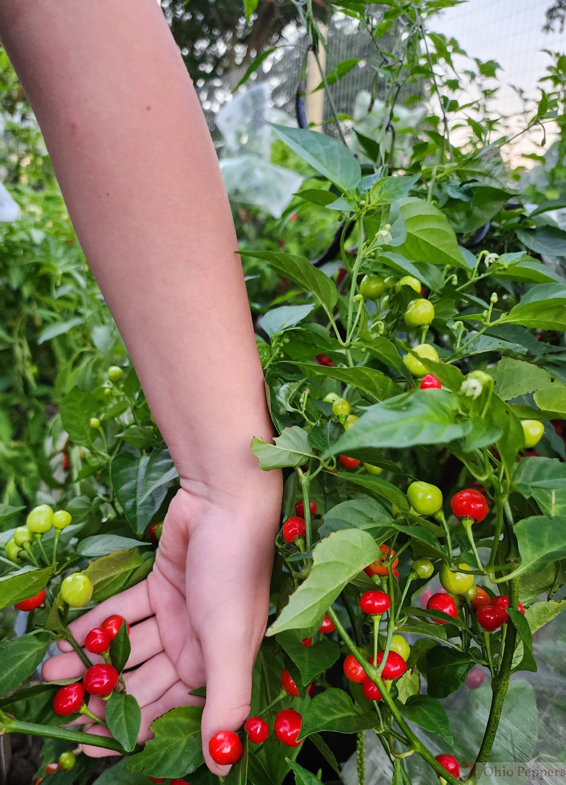 Wiri Wiri peppers resemble colorful cherries and are also sometimes given the generic moniker? “Hot Cherry Peppers” – not to be confused with other peppers with a more established nomenclature of hot cherry pepper (an annuum) or the Sweet Cherry Pepper (also an annuum). The fruit are small, about half an inch long, and bulb-like. The peppers grow upright on the plant. They change color from green to yellow, then orange, and finally to vibrant red when ripe.